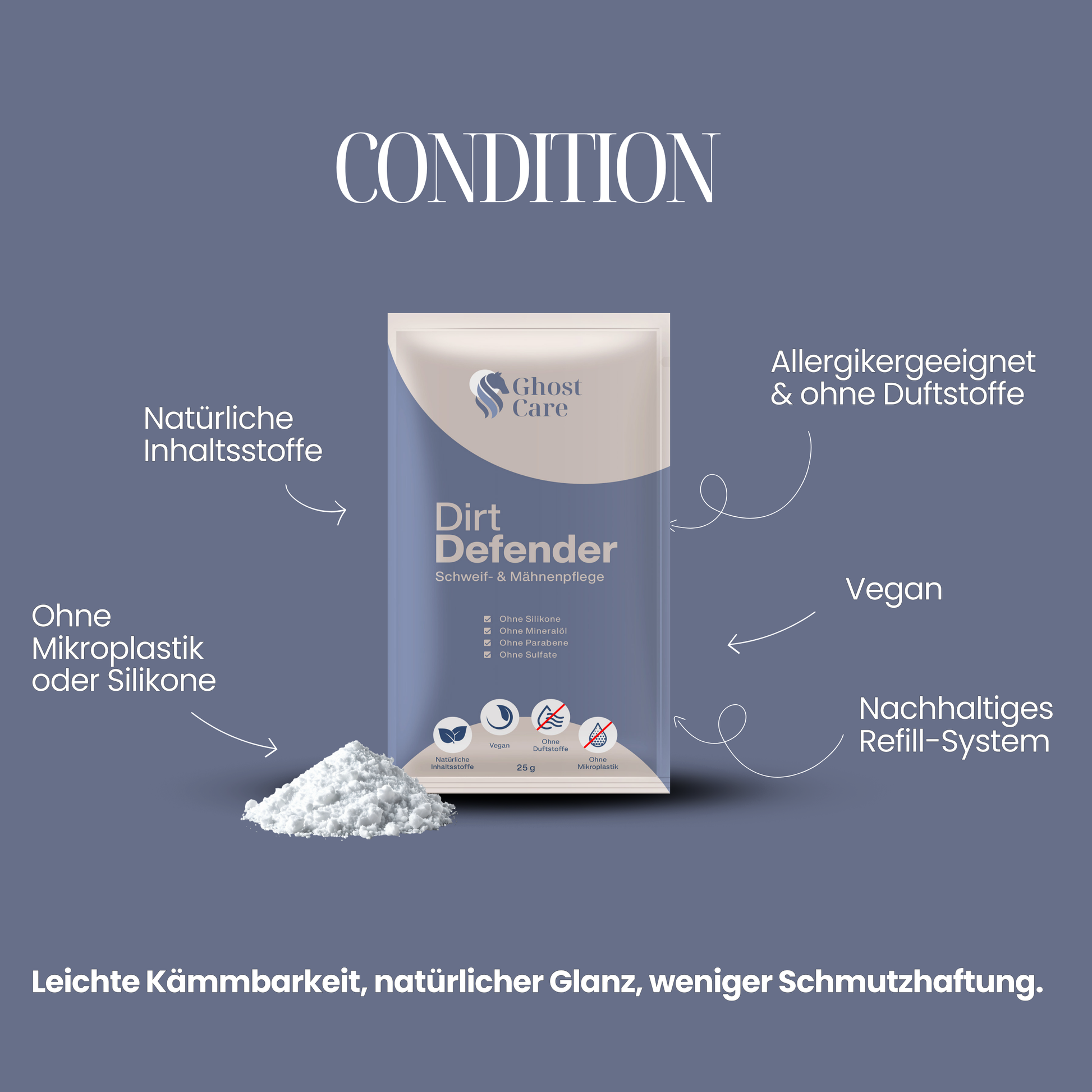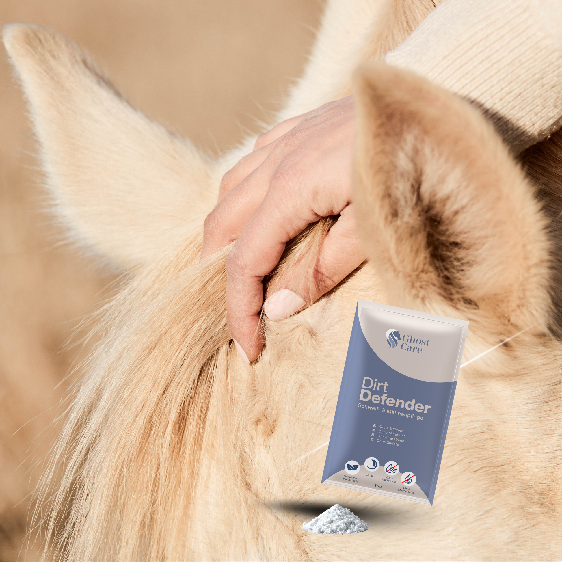 Dirt Defender ist eine innovative Schweif- & Mähnenpflege in Pulverform, entwickelt für Pferde im Sport, im Training und im täglichen Stallalltag. Die Pflege ist sanft zur Haut, frei von Duftstoffen und Mikroplastik und wirksam gegen Staub und Schmutz.