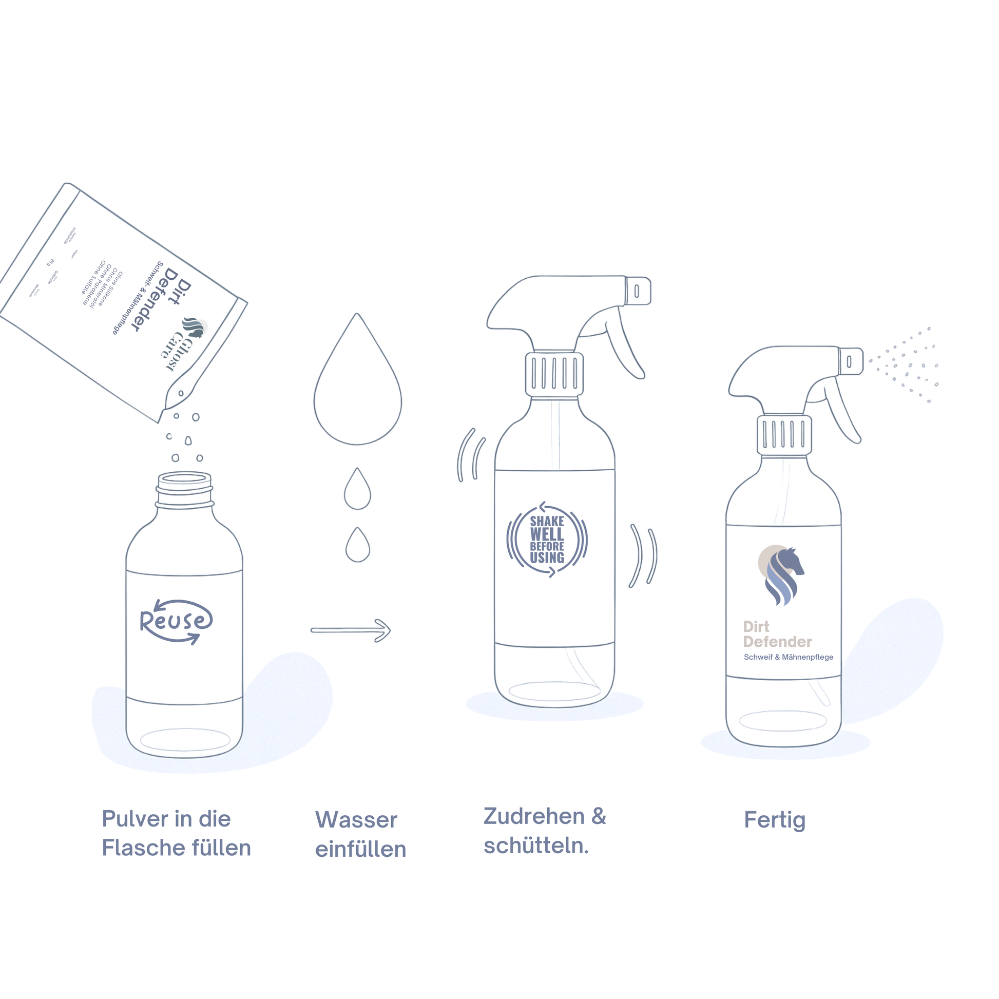 Dirt Defender kommt als lösliches Pflegepulver. Wasser wird erst im Stall hinzugefügt – nicht schon im Produkt.